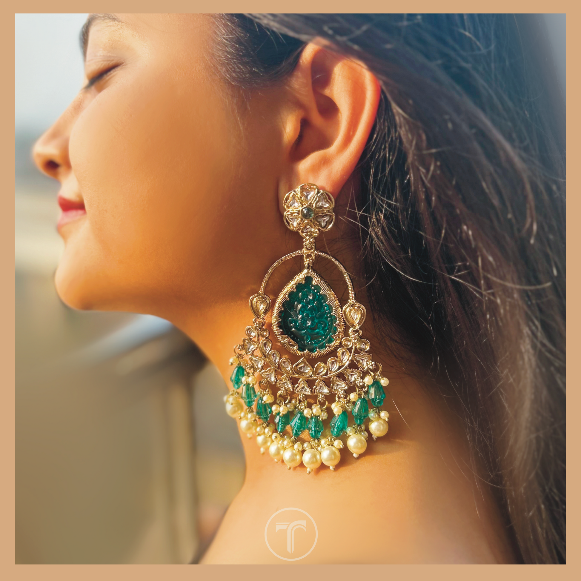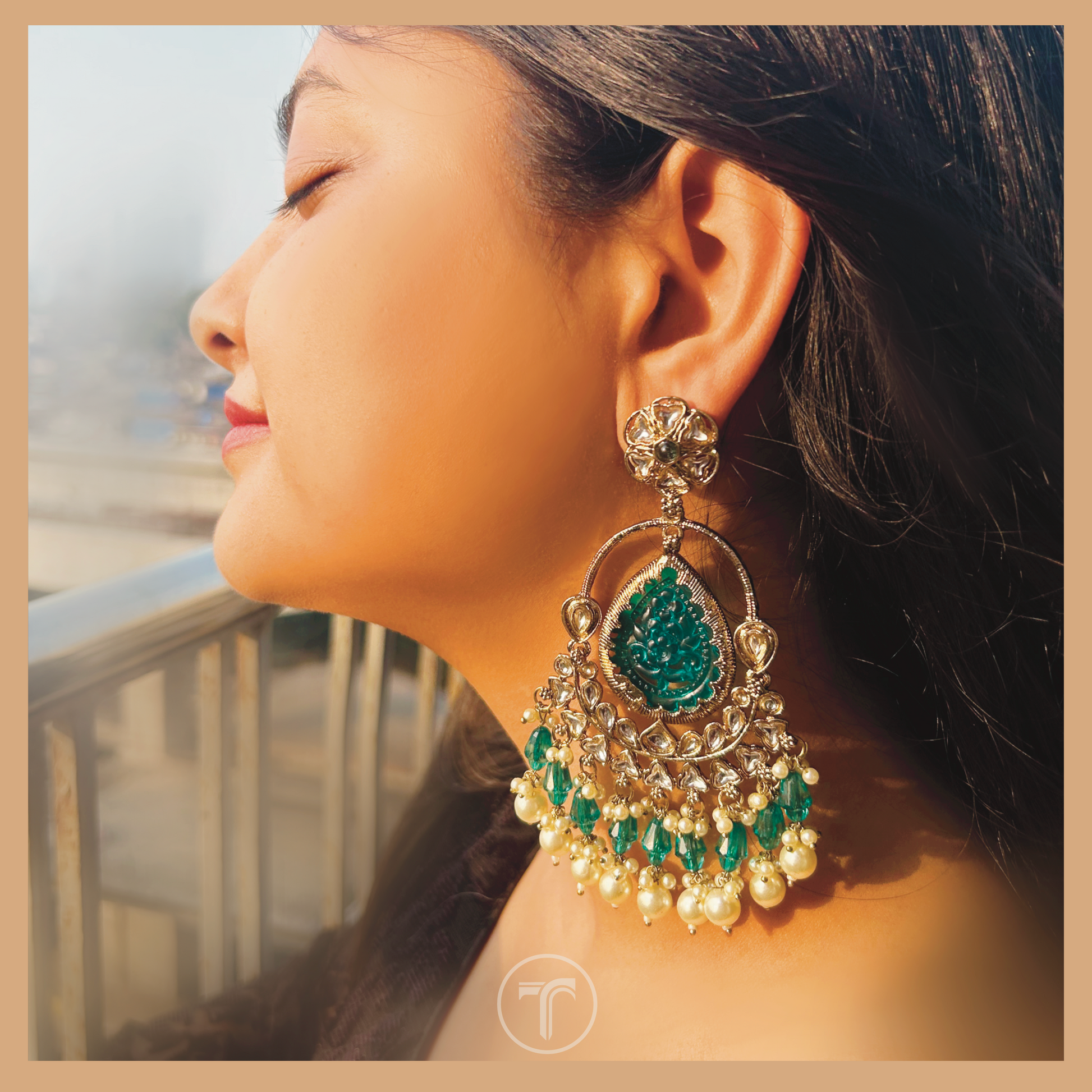 The Mariska Earrings are a stunning addition to any jewelry collection. These earrings shine bright and bold, with a beautiful combination of mirror, pearls, and a synthetic emerald carved stone. Elevate your style and make a statement with these jaw-dropping earrings.